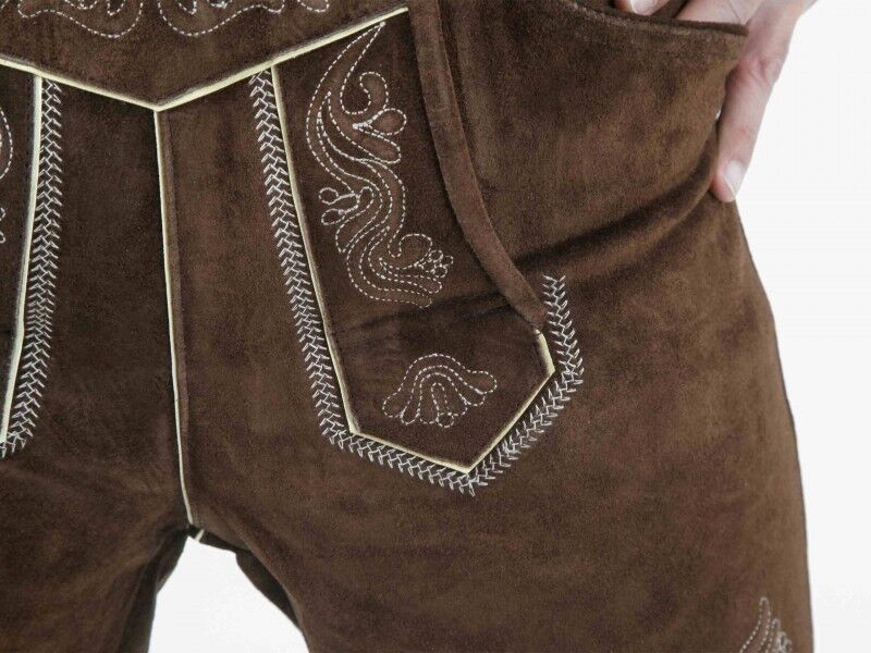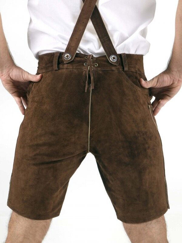 This Beautiful and stylish Choc. Brown lederhosen for men made of the finest materials processed high-quality. The Bavarian lederhosen is made of fine cowhide suede leather and guarantees a great fitting. The delivery of the Bavarian lederhosen contains suitable and adjustable suspenders in H-form with precious metal buckles. This Bavarian lederhosen for men has two front pockets, knife pocket and a back pocket. The latter can be closed with a matching dress button. Furthermore, the lederhosen can laced on the buttock and knee with fitting leather straps to make it more tight or wide.